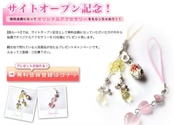 株式会社タンザワが運営する【旅ルート】では、サイトオープン記念として無料会員になっていただいた方の中から抽選でオリジナルアクセサリーを10名様にプレゼント致します。