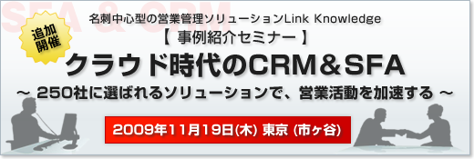 先般ご紹介させていただいた弊社セミナー、「クラウド時代のCRM&SFA事例 ~250社に選ばれるソリューションで、営業活動を加速する~」について、好評につき、同内容にて追加開催させていただくことになりました。