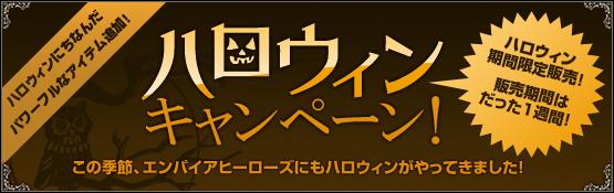 ロックワークス株式会社(本社:東京都港区 代表取締役社長:岡村隆)は、ゲームポータルサイト『GAMELEON(ガメレオン)』(http://www.gameleon.jp/) にてサービス中のブラウザゲーム「エンパイアヒーローズ~帝国遠征~」(http://emhero.gameleon.jp)にて本日10月28日(水)より「ハロウィンキャンペーン」を開始する事を発表いたします。