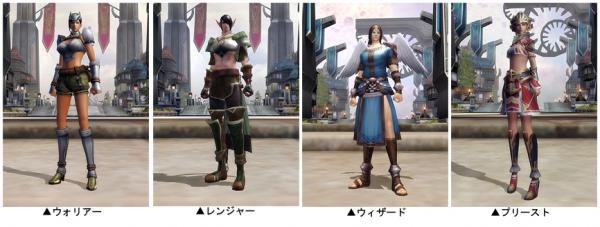 ウォーリアの方にはウォーリアα装備セット(左)、レンジャーの方にはレンジャーα装備セット(中左)、ウィザードの方にはウィザードα装備セット(中右)、プリーストの方にはプリーストα装備セット(右)をそれぞれ配布させて頂きます。