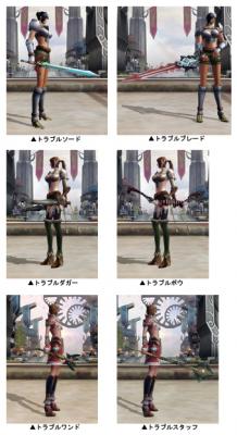 オープンαテスト時に発見した不具合をサポートに送ってくれた方全員にプレゼントさせて頂く賞品は2種類の武器。上から順に、ウォーリアに配布させて頂くトラブルソード(左)とトラブルブレード(右)、レンジャーに配布させて頂くトラブルダガー(左)とトラブルボウ(右)、ウィザードとプリーストに配布させて頂くトラブルワンド(左)とトラブルスタッフ(右)となります。