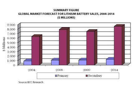 ウェルズリー、マサチューセッツ州:米国の技術市場調査会社BCC Researchが発行した調査報告書「Lithium Batteries: Markets and Materials」によると、世界におけるリチウムバッテリーの売上は、2009年に86億米ドルとなる見込みで、その後の5年間は年複利成長率(CAGR)2.8%で拡大し、2014年にはおよそ100億米ドルに到達すると予測されています。