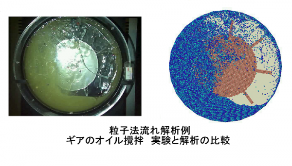 「MPS-RYUJIN」は、流体を粒子で表現する「粒子法」を基本とし、独自の機能を組み込んだFTR自社開発の流体解析ソフトウェアである。従来のメッシュベースの流体解析手法では、激しい変化の伴う自由表面(水面等)が含まれる流れの再現が非常に困難であった。その中で「MPS-RYUJIN」は自由表面のある流れの再現を可能とした。これまで実験での確認が主だった「ギアによるオイル攪拌」や「洗浄」といった分野を中心に実績を増やしている。