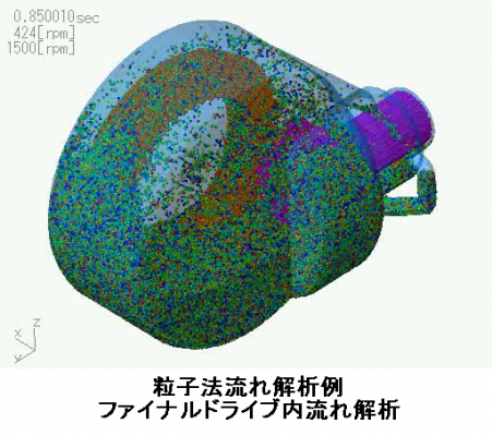 「MPS-RYUJIN」は、流体を粒子で表現する「粒子法」を基本とし、独自の機能を組み込んだFTR自社開発の流体解析ソフトウェアである。従来のメッシュベースの流体解析手法では、激しい変化の伴う自由表面(水面等)が含まれる流れの再現が非常に困難であった。その中で「MPS-RYUJIN」は自由表面のある流れの再現を可能とした。これまで実験での確認が主だった「ギアによるオイル攪拌」や「洗浄」といった分野を中心に実績を増やしている。