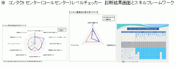コンタクトセンタースキルチェックでは新たに設定した「標準スキルフレームワーク」に基づいて全国のコンタクトセンターにおける汎用的な適性・知識・スキルなど明確化し診断・分かり易く可視可するもの。これを利用することで、採用試験、スキル・知識レベル把握、人材育成・研修、適材適所配置、すぐ辞めない人材の把握や、今までは把握することができなかった全国平均と比較して各センターの組織の強み、弱みを人材面から全体的に把握できるようになる。