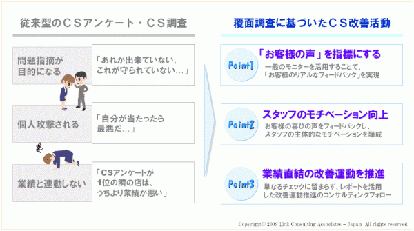 接客サービスが中心の業態において、調査員が一般のお客様を装ってサービスを受け、「お客様の視点」でそのお店のサービス・CS(顧客満足)を査定・評価する「市場リサーチ法」です。
