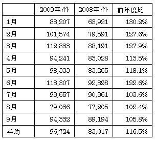 2009年の同市場合計では1月は「83,207件」、5月は、「98,333件」、