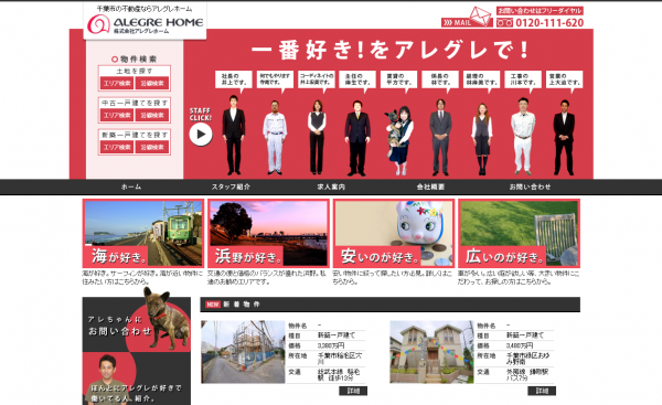 この度の『株式会社アレグレホーム』(http://www.alegre.co.jp/)様のWEBサイトは、千葉市を中心とした不動産情報サイトとなっております。自社ホームページ構築支援ASP「不動産検索Lab」を利用し、ポータルサイト「いえらぶ」と連動する形で、サイトを構築しております。