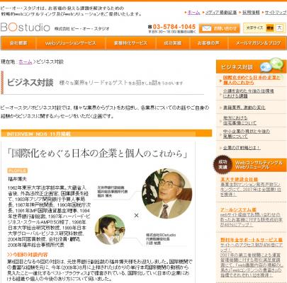 webコンサルティング及びwebマーケティングを中心に展開する、株式会社ビー・オー・スタジオ(http://www.bostudio.co.jp/ 本社:東京都渋谷区、代表取締役社長:川添祐貴)代表の川添が、元世界銀行副総裁福井博夫氏と『国際化をめぐる日本の企業と個人のこれから』というテーマで対談をしました。