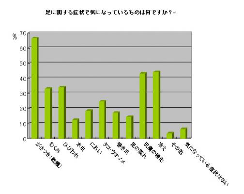 「がさつき(乾燥)」の回答を年代別に見てみると、30代:66.1%、40代:68%、50代:65.1%と40代が他の世代以上に気にかけているという傾向がありました。「がさがさがひどくて、素足になれない(53歳女性)」「足ががさがさしていると人に見られたとき恥ずかしい(31歳女性)」「がさがさがひどいせいでストッキングがひっかかる(44歳女性)」などの声も寄せられています。