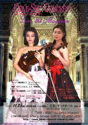 スペインは国の広さやその歴史的な成り立ちから、地方色が異なり、そのためにその音楽はリズムの種類が多くまた独自のものであるため、クラシック界では「本場の血を持つ人でなければ演奏できない」と言われますし、ファリャは「スペインの音楽家はギターの言葉で考える」と言ったそうです。しかし、ここは果敢に挑戦です。 前のフォークファンタジアでも取り上げたように、意外にDemi-Sec(ドゥミ・セック)はスペイン音楽と手が合うようです。地方色豊かな、多彩な、そして粋なスペイン音楽をこのコンサートでは堪能して頂きたいと思います。