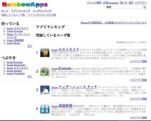 RainbowAppsでは、ユーザが自分の持っている(またはよく使っている)iPhoneアプリを登録することから、本当の意味で役立つ、便利で、おもしろいiPhoneアプリのデータを集計できます。そこで11月6日にベータリリースしてから約1週間のユーザのiPhoneアプリ登録データを集計し、みんなが持っているiPhoneアプリランキングを発表いたします。