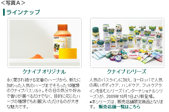 「ラインナップ」は、 "クナイプ オリジナル"(日本で24年間販売されているバスソルトなど)と"クナイプ iシリーズ"(インターナショナルで人気のシリーズを日本で発売。頭文字を取りiシリーズ)の2つに入口が分かれています。(写真A)