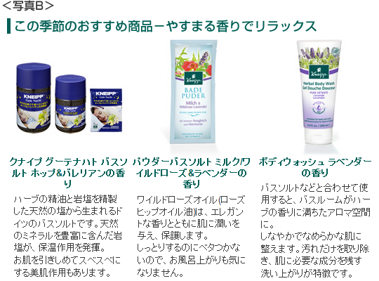 クナイプでは、好みや体調・ケアをしたいボディパーツに合わせて使っていただけるように、バスソルト以外にもハーブのエッセンシャルオイルを含んだボディケア・ハンドケア・フットケア商品を販売しています。クナイプの種類の豊富さからどれを選んで良いのか悩まれる方のために、季節に応じた悩み(風邪・乾燥・花粉症・日焼けなど)や疲れなどの症状にぴったりのハーブを使った商品を、ご紹介していきます。(写真B)