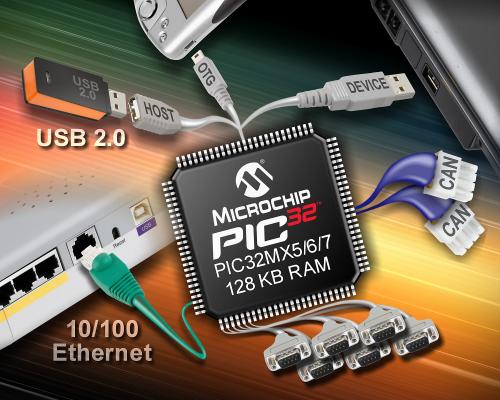 組み込み接続に対する要望が高まる中、既存の製品でより多数のソフトウェア スタックを同時に動作させる必要性が増しています。今回発表するPIC32MX5/6/7新ファミリは、このようなデータ量の多いアプリケーションに特化して設計されています。そのため設計者は、最大128 KBのRAMにフルアクセスして、EthernetやUSB、CANバッファを同時に使用できます。内蔵Ethernet、CAN、USBモジュールはDMAインターフェイスを内蔵しており、データ スループットの最大化を実現します。