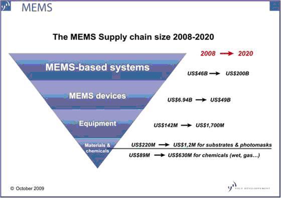 MEMS市場がプラス成長に転じるのは、2010年以降になる見通しであり、今後4年間の年平均成長率は12%程度と予想されます。また製造機器市場は、回復が遅れる可能性が高く(売上高は、2008年から2010年まで1億4,000万ドルで推移)、成長軌道に乗るのは2011年以降になると思われます。