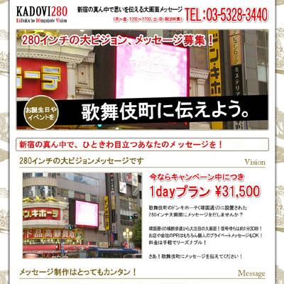 株式リタではkadovi.com(株式会社INSOMMA運営)のWEBサイトを制作しました。 このKADOVi.com(カドビ)は歌舞伎町のドンキーホーテに設置された大型モニターから個人のプライベートメッセージを表示するサービスです。2009年11月から2010年1月まではキャンペーン価格31500円です。 http://www.kadovi.com