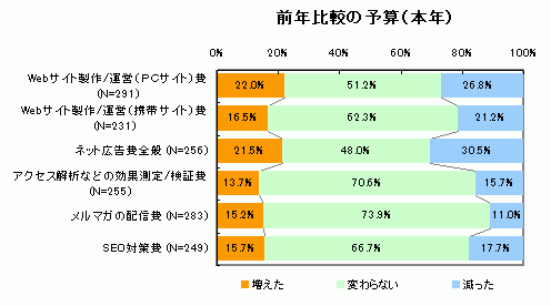 一方、Webに関する予算の前年度比較では、他の項目が落ち込む中、メルマガ配信費だけがプラスになりました。多額の費用をかけずに実施できるメールマーケティングに注力する傾向が見られました。