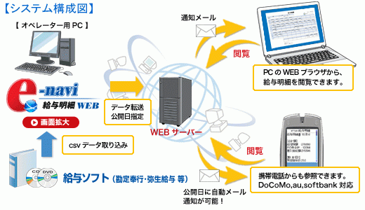 すでに販売されている、給与明細書・賞与明細書をパソコン・携帯電話にメールで配信するソフト「e-navi給与明細メール」に、今回販売する「e-navi給与明細WEB」が加わり、より企業のニーズに合わせた製品が提供可能となりました。