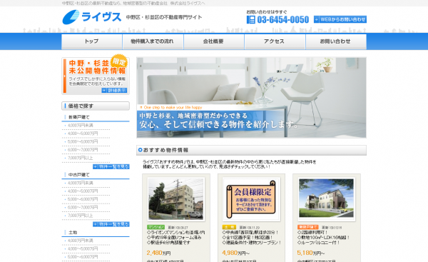 この度の『株式会社ライヴス』(http://www.lives-corp.co.jp/)様のホームページは、中野区・杉並区エリアの最新の不動産情報をお届けしております。自社ホームページ構築支援ASP「不動産検索Lab」を利用し、ポータルサイト「いえらぶ」と連動する形で、サイトを構築しております。