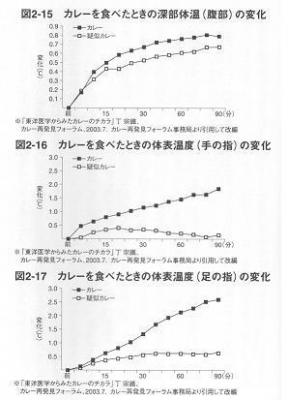 日本薬科大学教授の丁宗鐵氏によれば、カレーには深部体温と体表体温のいずれについても体温を上昇させる効果がみられることが明らかになりました。とくに体表温度への効果は顕著で約1.5度~2.5以上の上昇が確認されています。(図表参照)