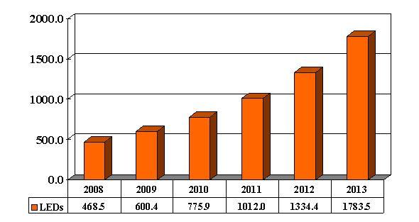 2008年に世界において試験/測定器具および医療関連(機器/器具)に使用されたLEDの数は、4億6,850万個に達しました(図1)。この利用数は今後30.7%の年間成長率で増加し、2012年には17億8,300万個に達すると予測されています。