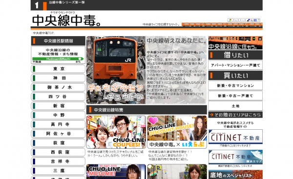 この『中央線中毒。』は、中央線ライフ応援サイトとして、中央線各駅の情報をまとめたサイトとなっております。中央線沿線の住まい情報や吉祥寺駅、三鷹駅、高円寺駅など、各駅の賃貸不動産や売買不動産情報、中央線好きカップルのフォトスナップ、おすすめショップ情報など、中央線沿線にこだわった情報を掲載しております。