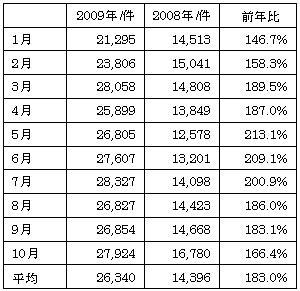 2009年の同市場合計では1月は「21,295件」、5月は、「26,805件」、