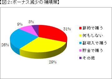 また、ボーナスが「支給されない」もしくは「支給額が減少した」ことへの補填策としては、全体の30%が「節約する」「何もしない」と回答しており、ほぼ同数の30%が「副業で補う」と回答しております。(※図2参照)