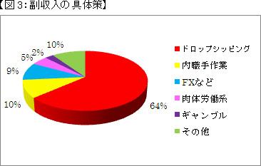 「副業で補う」方法の内訳としては、は60%の方が「ドロップシッピング」と回答しており、「FX」や「ギャンブル」などリスクが伴う副業は10%に満たない回答数でした。