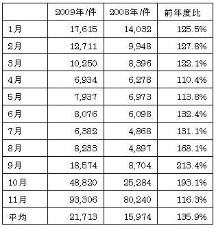 2009年の同市場合計では1月は「14,032件」、6月は、「6,098件」、11月は「80,240件」の