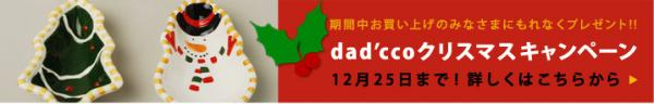 2009年12月25日までのキャンペーン期間中、dad'cco商品をお買い上げ頂いたお客様全員にもれなくクリスマスモチーフの可愛い小皿をプレゼント致します。