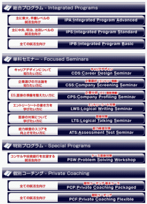 具体的には、受講生のレベルや狙っている企業のタイプに応じてクラス分けを行い、受講生のニーズに直結した指導を行います。また、就職活動に関わる重要な領域を包括的にカバーした「総合プログラム」に加えて、講義形式の「単科セミナー」や「個人コーチング」などのプログラムを順次開講していく予定です。