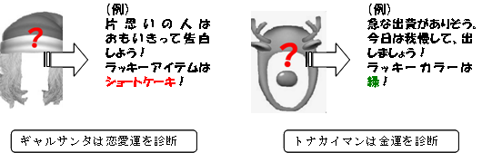 キャラクターの色によって、恋愛運、金運に関する占い結果が変わるようになっております。