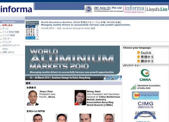 株式会社グローバル インフォメーションでは、皆様の利便性を図る為に、日本語、英語、韓国語、中国語で「World Aluminium Markets 2010(世界のアルミニウム市場:2010年会議)」の情報を提供するとともに、会議の参加のお申し込みを承っております。