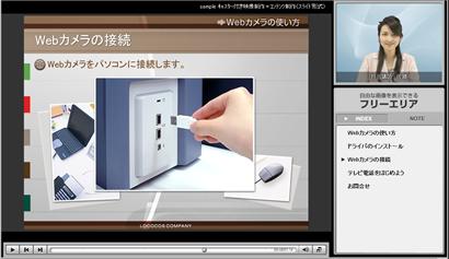 また、コンテンツ内で表示するプレゼン資料は、パワーポイントからアニメーション効果付きでFlash形式に自動変換されるものです。