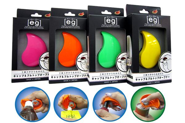 [eg] は、握る力を極力小さくするため、キャップを軽く押し込む力を「くさび効果」により大きな握る力に変え、特殊ゴムの摩擦を応用した形状により[eg] を回転させる力で