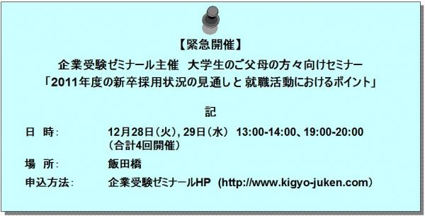 企業受験ゼミナールでは、大学生の親からの問い合わせが増えている状況に答え、12月27日および28日に就活生の親を対象としたセミナーを緊急開催することを決定しました。