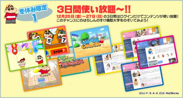 オンラインゲーム配信企業のロックワークス株式会社(本社:東京都港区、代表取締役社長:岡村隆 以下、ロックワークス)は、クレヨンしんちゃんが学長を務めるオンラインの大学 "のはらしんのすけ儀塾大学"(http://www.edu904.com)"にて冬休み限定企画として、すべてのコンテンツを無料開放するキャンペーン「3日間使い放題キャンペーン」を開催する他、