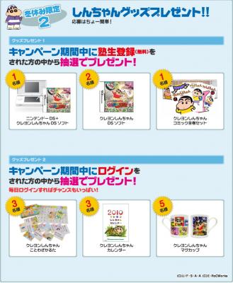 本キャンペーンは、12月25日(金)~1月17日(日)までの期間中、無料塾生登録をされた方の中から抽選でステキなクレヨンしんちゃんグッズが当たるプレゼントキャンペーンとなります。