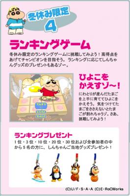 限定企画第4弾は、プレゼントが当たるランキングイベントです。ランキングゲームに参加して、期間中1位・3位・10位・20位・30位および全参加者の中から5名の方に、しんちゃんご当地グッズをプレゼントします。