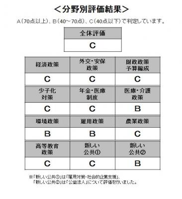 12分野の中でAとされたものはなく、医療・介護政策、環境政策、雇用政策、新しい公共(2)の4分野がBとされましたが、残りの8分野はC判定となりました。実行過程、説明責任に対する評価は全分野で厳しく、外交・安全保障分野の実行過程は0点(20点満点)、少子化対策や年金・医療制度分野の説明責任が2点(20点満点)などとなっています。