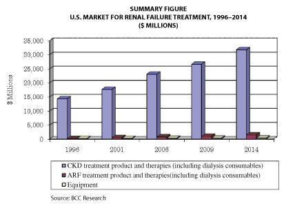 ウェルズリー、マサチューセッツ州:米国の調査会社BCC Researchが発行した技術市場調査報告書「RENAL DISEASE TREATMENTS: PRODUCTS AND THERAPIES」によると、2009年における世界の腎疾患治療市場は280億米ドルとなり、その後の5年間は、年複利成長率(CAGR)3.7%で成長し、2014年には335億米ドルに達する見込みです。