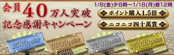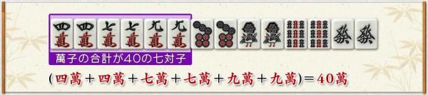 40万人にちなみ、七対子(ニコニコ)で萬子の合計がぴったり「40」の牌譜をサポート係に送ったプレイヤーの方全員に、場代ポイント1,000ポイント(1,000円相当)をプレゼントします。期間中のあがり牌譜であれば何度でも応募可能です。
