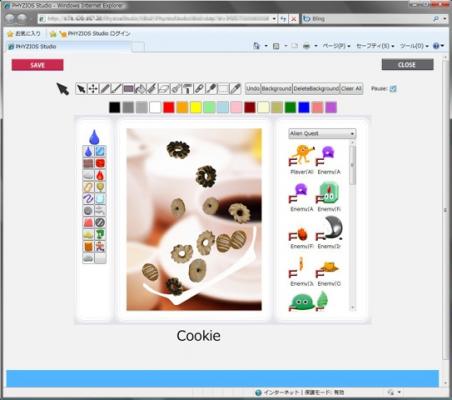 現在ベータ版を無料公開中の、「描いた絵が動いてゲームになる」Webサービスです。アート作品やゲームのプレイと作成が楽しめます。創った作品は世界のユーザーに公開し、遊びを共有することができます。2008年のGDC (Game Developers Conference) にて好評を博し、国内外で8万超のダウンロードを記録した物理シミュレーションソフト「OE-Cake!」をバージョンアップし、Web化したものが「PHYZIOS Studio」です。