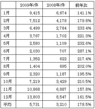 2009年の同市場合計では1月は「9,415件」、6月は、「2,030件」、12月は「13,803件」の落札数となっておりました。