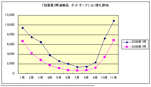 ■「加湿器」関連商品の落札動向(2008年1~12月、2009年1~12月)