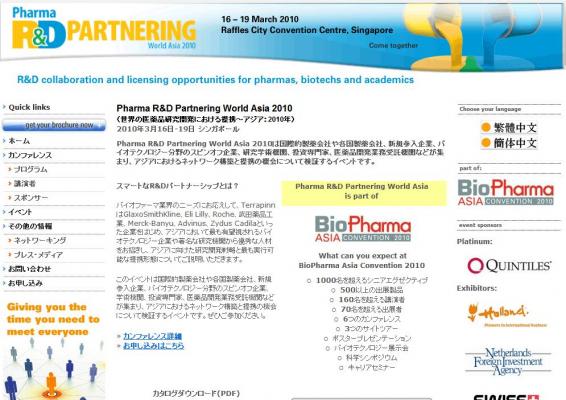 Pharma R&D Partnering World Asia 2010は国際的製薬会社や各国製薬会社、新規参入企業、バイオテクノロジー分野のスピンオフ企業、研究学術機関、投資専門家、医薬品開発業務受託機関などが集まり、アジアにおけるネットワーク構築と提携の機会について検証するイベントです。