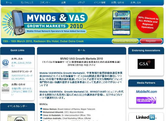 「MVNO VAS Growth Markets 2010 (モバイル付加価値サービス/仮想移動体通信事業者のための成長戦略会議)」の情報を提供するとともに、会議の参加のお申し込みを承っております。