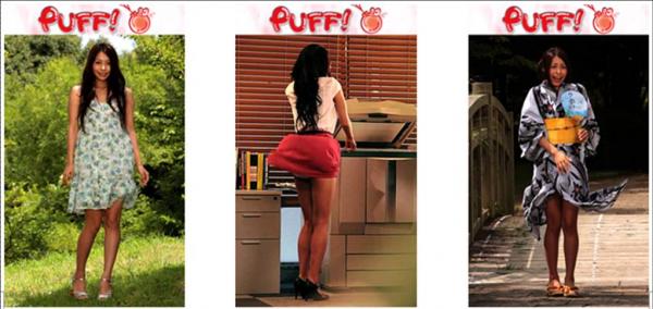『PUFF!』は、スカートめくりをしていたときのイタズラ心や冒険心を呼び起こす、遊び心満載のアプリケーション。選りすぐりの女の子3人がさまざまなシチュエーションと衣装で登場。携帯端末のマイクに向かって息を吹きかけると、女の子のスカートがめくれます! タッチペンで画面を下から上にこすることで、同じことができます。息の長さや画面をこする回数によって、女の子の表情やリアクション、スカートのめくれ方が変わるので、いろいろチャレンジして遊ぶことができます。